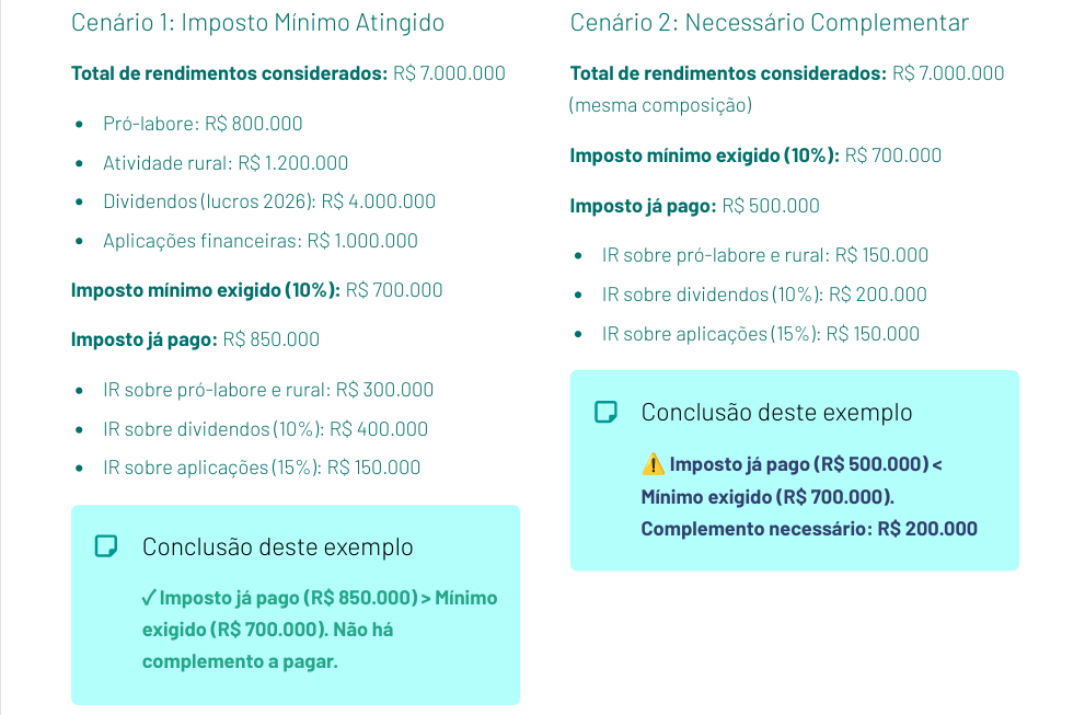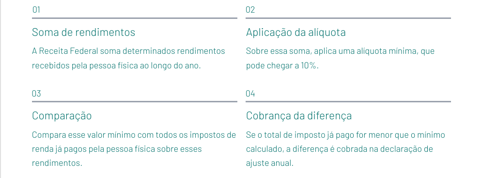 O imposto mínimo apurado é então comparado com o imposto já recolhido pelo contribuinte. Caso o montante pago seja inferior ao mínimo exigido, a diferença será cobrada na declaração anual de ajuste.