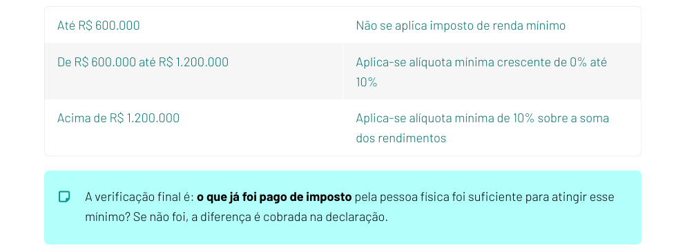A regra não se aplica a rendimentos anuais de até R$ 600 mil. Entre R$ 600 mil e R$ 1,2 milhão, a lei prevê uma alíquota progressiva que varia de 0% a 10%. Já para rendimentos acima de R$ 1,2 milhão, a alíquota mínima de 10% incide diretamente sobre a soma dos rendimentos. Na prática, o contribuinte precisará verificar se o imposto já recolhido ao longo do ano foi suficiente para atingir esse patamar. Caso contrário, haverá cobrança complementar.